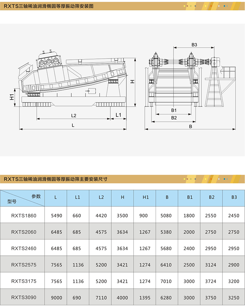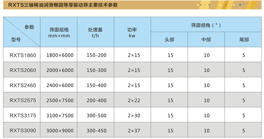 RXTS 系列椭圆等厚振动筛和同规格其它型号筛机相比,有更大的处理量和更高的筛分效率,适用于冶金行业的溶剂、冷烧结矿筛分、矿山行业的矿石分级,煤炭行业的分级及脱水、脱介等作业,是现有大型振动筛及国外引进产品的理想替代产品。